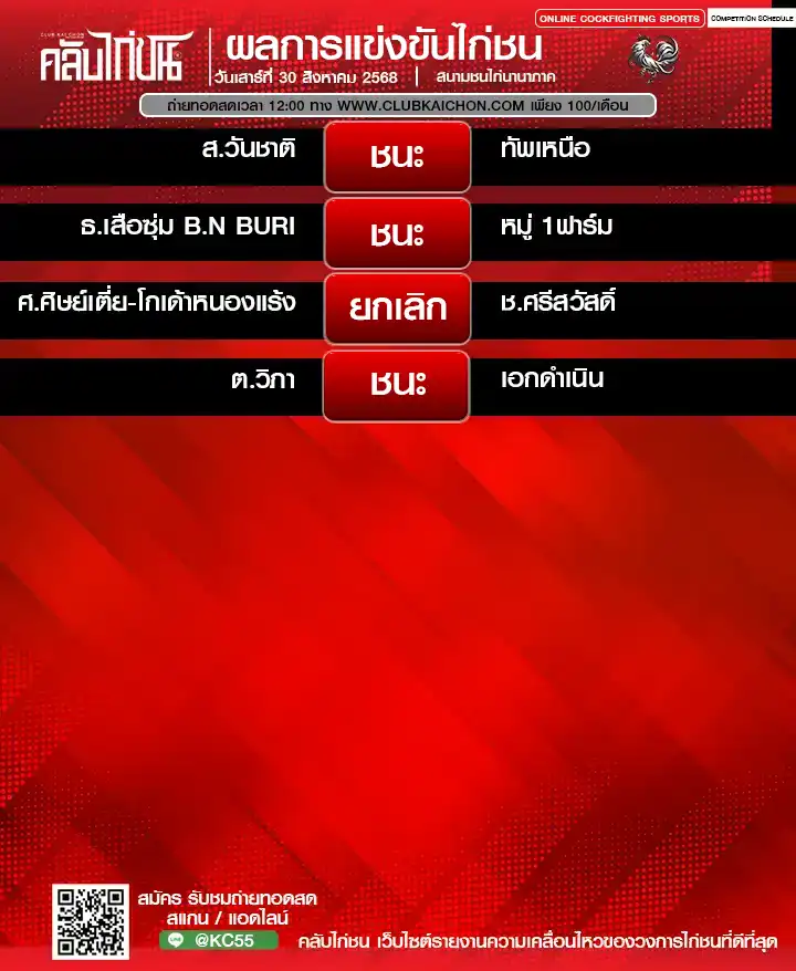 สรุปผลไก่ชน 30 สิงหาคม 68 สนามชนไก่นานาภาค