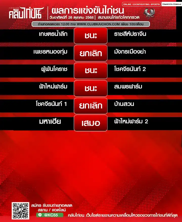 สำหรับคอไก่ชนทุกท่านที่กำลังมองหา โปรแกรมไก่ชนวันนี้ หรือต้องการรับชม ไก่ชนสด แบบเกาะติดขอบสนาม วันนี้เรามีข่าวดีมาฝาก! ทาง คลับไก่ชน ขอเชิญทุกท่านร่วมชมการแข่งขันไก่ชนออนไลน์จาก สนามชนไก่แก้วโคกกรวด ในวันที่ 26 ตุลาคม 2568 โดยสามารถรับชม ถ่ายทอดสดไก่ชน ได้ฟรี ไม่มีค่าใช้จ่าย