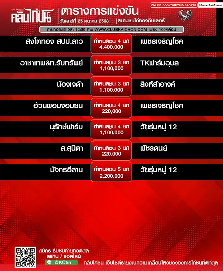 สำหรับคอไก่ชนทุกท่านที่กำลังมองหา โปรแกรมไก่ชนวันนี้ หรือต้องการรับชม ไก่ชนสด แบบเกาะติดขอบสนาม วันนี้เรามีข่าวดีมาฝาก! ทาง คลับไก่ชน ขอเชิญทุกท่านร่วมชมการแข่งขันไก่ชนออนไลน์จาก สนามชนไก่ทองอินเตอร์ ในวันที่ 25 ตุลาคม 2568 โดยสามารถรับชม ถ่ายทอดสดไก่ชน ได้ฟรี ไม่มีค่าใช้จ่าย