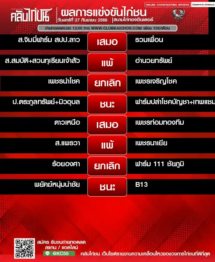 สำหรับคอไก่ชนทุกท่านที่กำลังมองหา โปรแกรมไก่ชนวันนี้ หรือต้องการรับชม ไก่ชนสด แบบเกาะติดขอบสนาม วันนี้เรามีข่าวดีมาฝาก! ทาง คลับไก่ชน ขอเชิญทุกท่านร่วมชมการแข่งขันไก่ชนออนไลน์จาก สนามไก่ทองอินเตอร์ ในวันที่ 27 กันยายน 2568 โดยสามารถรับชม ถ่ายทอดสดไก่ชน ได้ฟรี ไม่มีค่าใช้จ่าย