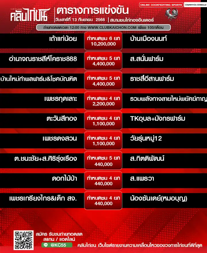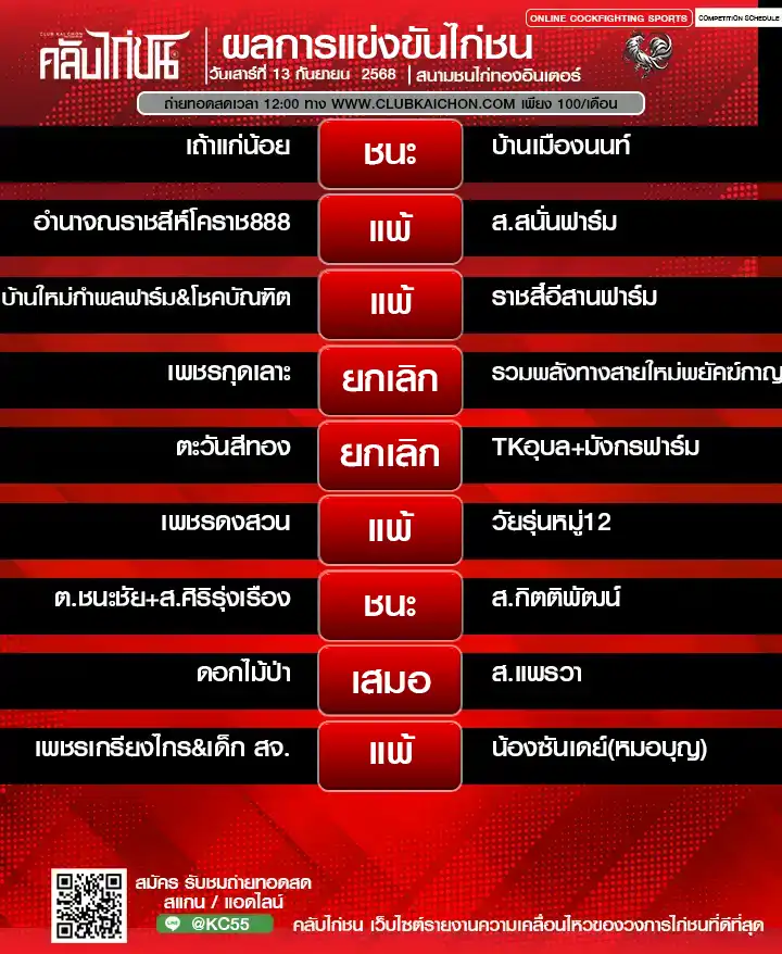 สำหรับคอไก่ชนทุกท่านที่กำลังมองหา โปรแกรมไก่ชนวันนี้ หรือต้องการรับชม ไก่ชนสด แบบเกาะติดขอบสนาม วันนี้เรามีข่าวดีมาฝาก! ทาง คลับไก่ชน ขอเชิญทุกท่านร่วมชมการแข่งขันไก่ชนออนไลน์จาก สนามชนไก่ทองอินเตอร์ ในวันที่ 13 กันยายน 2568 โดยสามารถรับชม ถ่ายทอดสดไก่ชน ได้ฟรี ไม่มีค่าใช้จ่าย