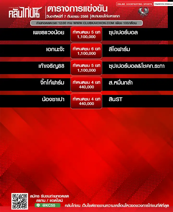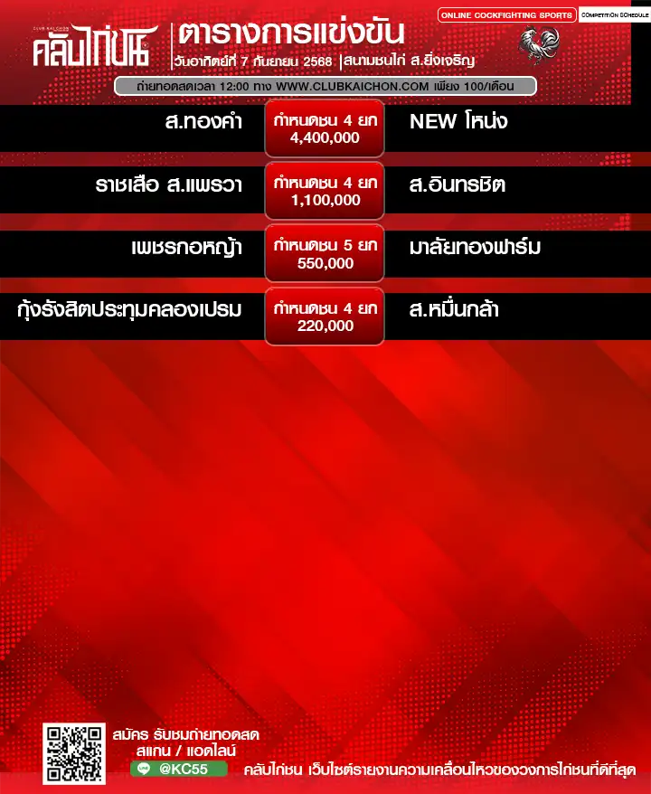 สำหรับคอไก่ชนทุกท่านที่กำลังมองหา โปรแกรมไก่ชนวันนี้ หรือต้องการรับชม ไก่ชนสด แบบเกาะติดขอบสนาม วันนี้เรามีข่าวดีมาฝาก! ทาง คลับไก่ชน ขอเชิญทุกท่านร่วมชมการแข่งขันไก่ชนออนไลน์จาก สนามชนไก่นานาภาค ในวันที่ 7 กันยายน 2568 โดยสามารถรับชม ถ่ายทอดสดไก่ชน ได้ฟรี ไม่มีค่าใช้จ่าย