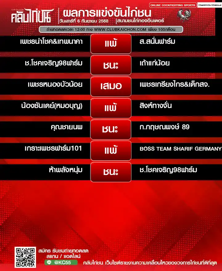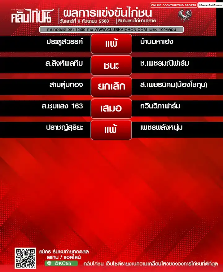 สำหรับคอไก่ชนทุกท่านที่กำลังมองหา โปรแกรมไก่ชนวันนี้ หรือต้องการรับชม ไก่ชนสด แบบเกาะติดขอบสนาม วันนี้เรามีข่าวดีมาฝาก! ทาง คลับไก่ชน ขอเชิญทุกท่านร่วมชมการแข่งขันไก่ชนออนไลน์จาก สนามชนไก่นานาภาค ในวันที่ 6 กันยายน 2568 โดยสามารถรับชม ถ่ายทอดสดไก่ชน ได้ฟรี ไม่มีค่าใช้จ่าย