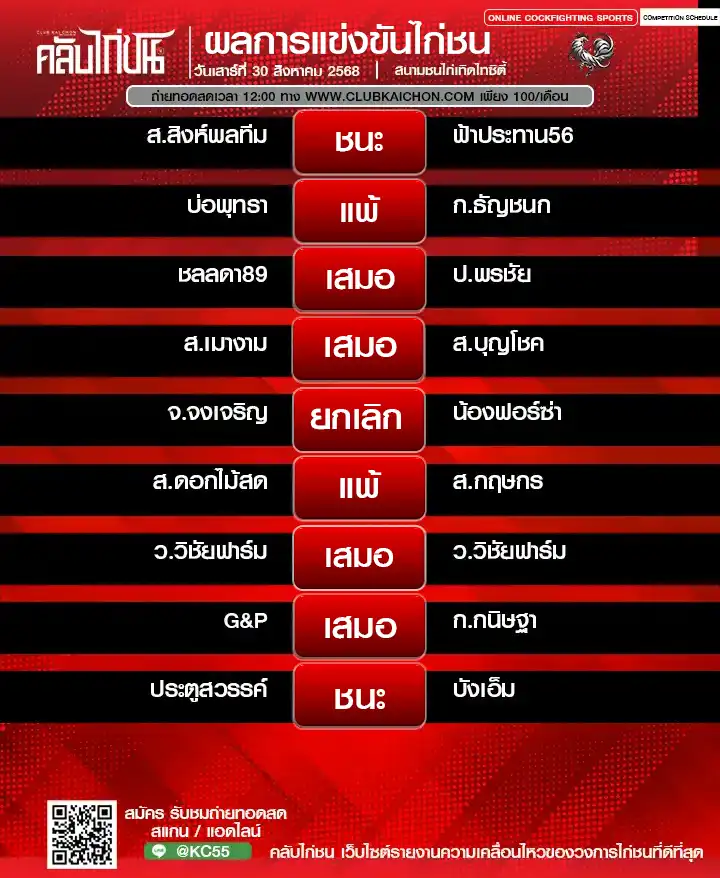 สำหรับคอไก่ชนทุกท่านที่กำลังมองหา โปรแกรมไก่ชนวันนี้ หรือต้องการรับชม ไก่ชนสด แบบเกาะติดขอบสนาม วันนี้เรามีข่าวดีมาฝาก! ทาง คลับไก่ชน ขอเชิญทุกท่านร่วมชมการแข่งขันไก่ชนออนไลน์จาก สนามชนไก่ทองอินเตอร์ ในวันที่ 30 สิงหาคม 2568 โดยสามารถรับชม ถ่ายทอดสดไก่ชน ได้ฟรี ไม่มีค่าใช้จ่าย