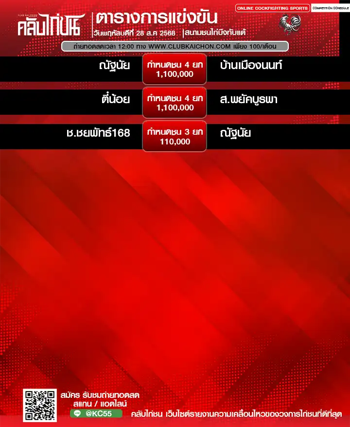 📣 วันนี้เว็บไซต์ “คลับไก่ชน” ของเรามีโปรแกรมไก่ชนสุดเดือดจาก 7 สนามใหญ่ทั่วประเทศ!