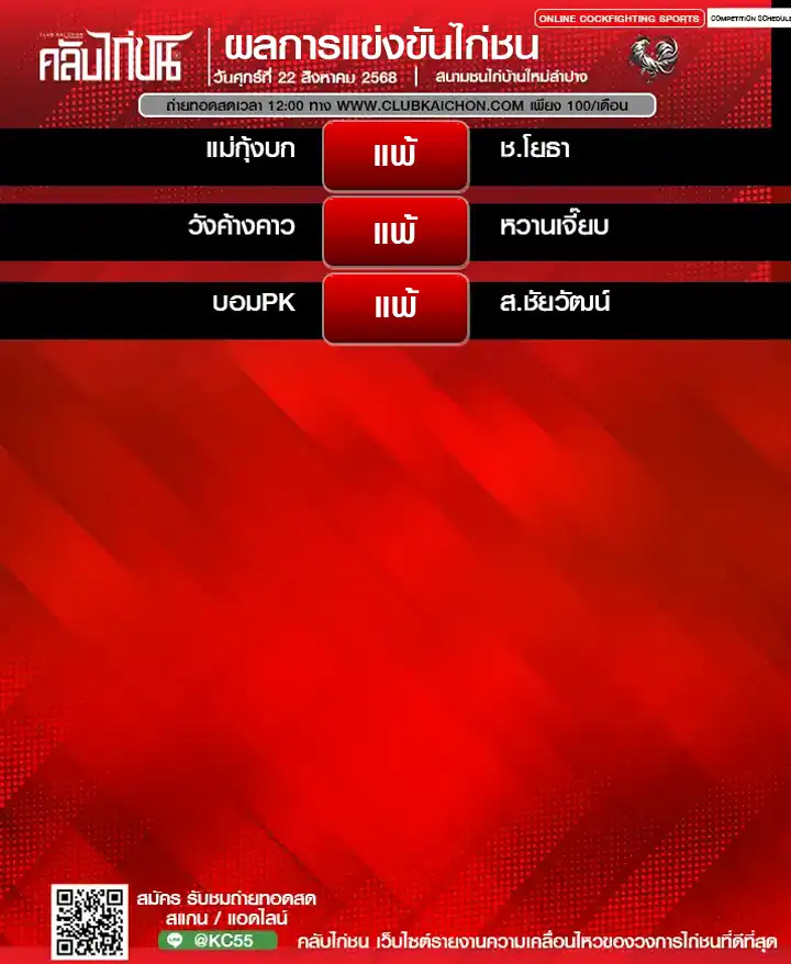 สำหรับคอไก่ชนทุกท่านที่กำลังมองหา โปรแกรมไก่ชนวันนี้ หรือต้องการรับชม ไก่ชนสด แบบเกาะติดขอบสนาม วันนี้เรามีข่าวดีมาฝาก! ทาง คลับไก่ชน ขอเชิญทุกท่านร่วมชมการแข่งขันไก่ชนออนไลน์จาก สนามชนไก่บ้านใหม่ลำปาง ในวันที่ 22 สิงหาคม 2568 โดยสามารถรับชม ถ่ายทอดสดไก่ชน ได้ฟรี ไม่มีค่าใช้จ่าย