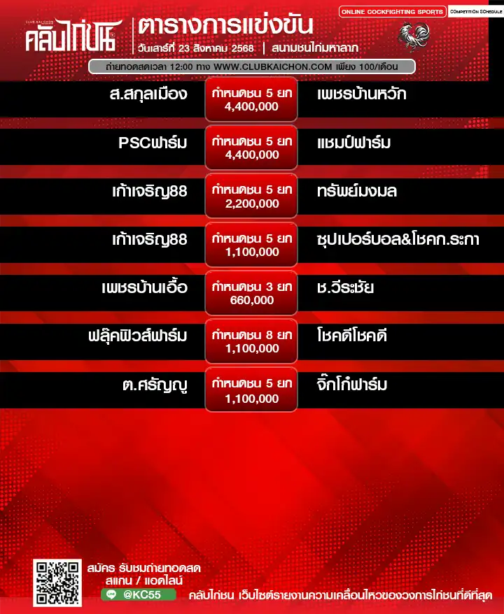 สำหรับคอไก่ชนทุกท่านที่กำลังมองหา โปรแกรมไก่ชนวันนี้ หรือต้องการรับชม ไก่ชนสด แบบเกาะติดขอบสนาม วันนี้เรามีข่าวดีมาฝาก! ทาง คลับไก่ชน ขอเชิญทุกท่านร่วมชมการแข่งขันไก่ชนออนไลน์จาก สนามชนไก่มหาลาภ ในวันที่ 23 สิงหาคม 2568 โดยสามารถรับชม ถ่ายทอดสดไก่ชน ได้ฟรี ไม่มีค่าใช้จ่าย