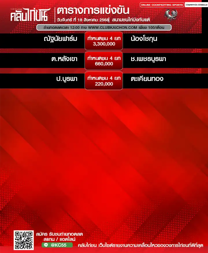 สำหรับคอไก่ชนทุกท่านที่กำลังมองหา โปรแกรมไก่ชนวันนี้ หรือต้องการรับชม ไก่ชนสด แบบเกาะติดขอบสนาม วันนี้เรามีข่าวดีมาฝาก! ทาง คลับไก่ชน ขอเชิญทุกท่านร่วมชมการแข่งขันไก่ชนออนไลน์จาก สนามชนไก่บึงทับแต้ ในวันที่ 18 สิงหาคม 2568 โดยสามารถรับชม ถ่ายทอดสดไก่ชน ได้ฟรี ไม่มีค่าใช้จ่าย