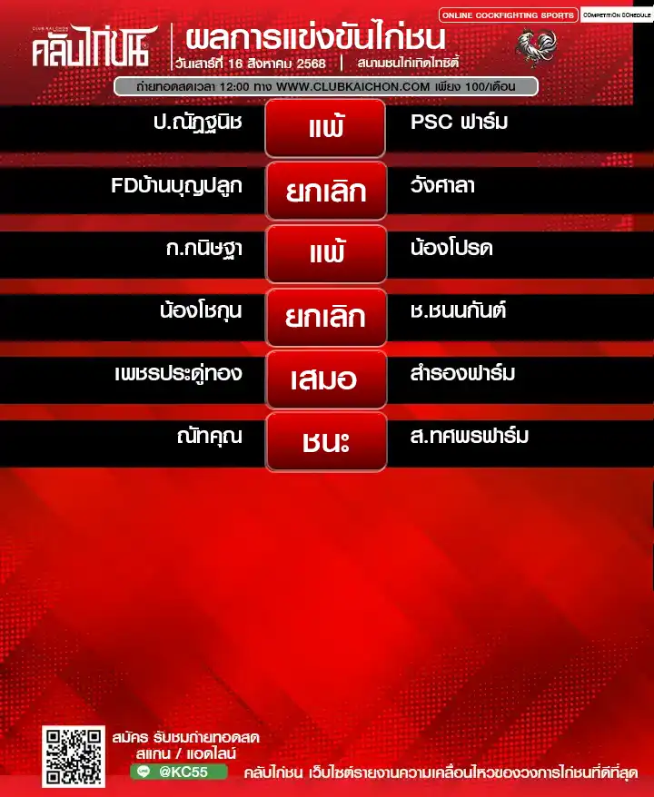 📣 วันนี้เว็บไซต์ “คลับไก่ชน” ของเรามีโปรแกรมไก่ชนสุดเดือดจาก 7 สนามใหญ่ทั่วประเทศ!