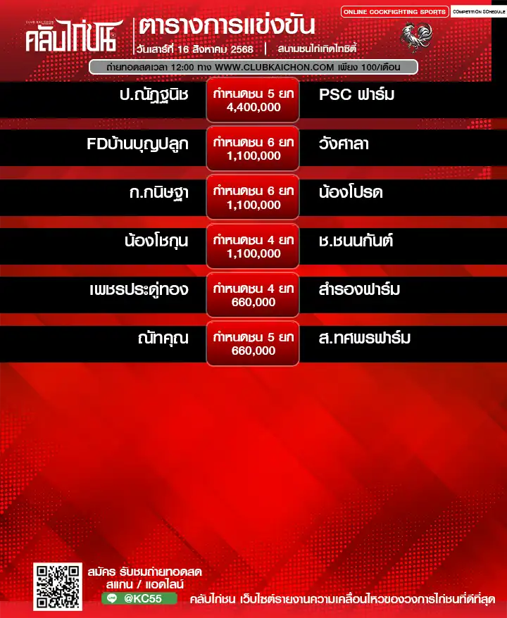 📣 วันนี้เว็บไซต์ “คลับไก่ชน” ของเรามีโปรแกรมไก่ชนสุดเดือดจาก 7 สนามใหญ่ทั่วประเทศ!