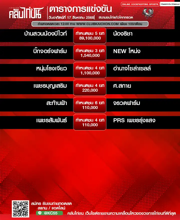 สำหรับคอไก่ชนทุกท่านที่กำลังมองหา โปรแกรมไก่ชนวันนี้ หรือต้องการรับชม ไก่ชนสด แบบเกาะติดขอบสนาม วันนี้เรามีข่าวดีมาฝาก! ทาง คลับไก่ชน ขอเชิญทุกท่านร่วมชมการแข่งขันไก่ชนออนไลน์จาก สนามชนไก่แก้วโคกกรวด ในวันที่ 17 สิงหาคม 2568 โดยสามารถรับชม ถ่ายทอดสดไก่ชน ได้ฟรี ไม่มีค่าใช้จ่าย
