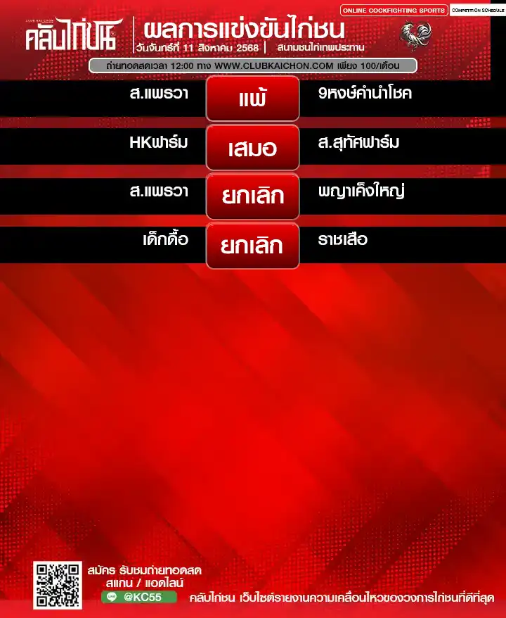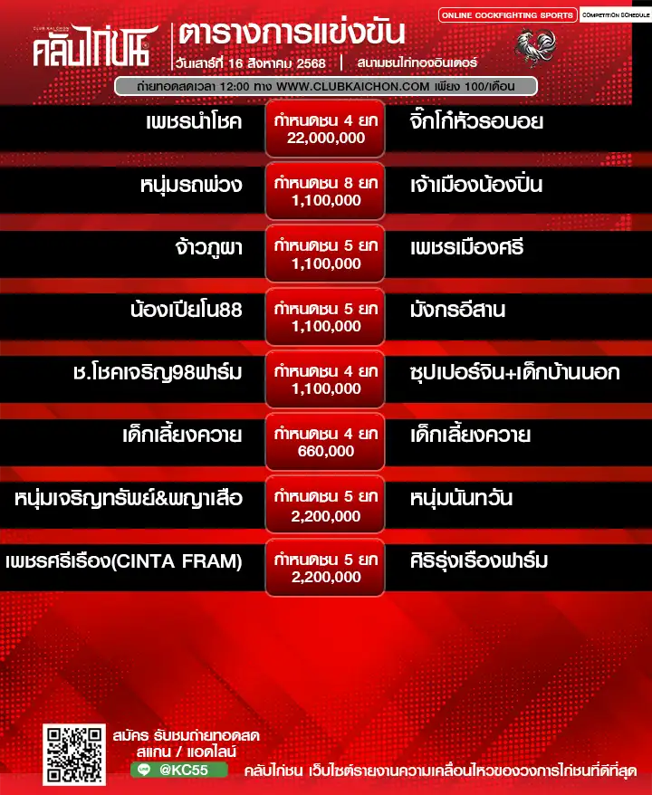 สำหรับคอไก่ชนทุกท่านที่กำลังมองหา โปรแกรมไก่ชนวันนี้ หรือต้องการรับชม ไก่ชนสด แบบเกาะติดขอบสนาม วันนี้เรามีข่าวดีมาฝาก! ทาง คลับไก่ชน ขอเชิญทุกท่านร่วมชมการแข่งขันไก่ชนออนไลน์จาก สนามชนไก่ทองอินเตอร์ ในวันที่ 16 สิงหาคม 2568 โดยสามารถรับชม ถ่ายทอดสดไก่ชน ได้ฟรี ไม่มีค่าใช้จ่าย