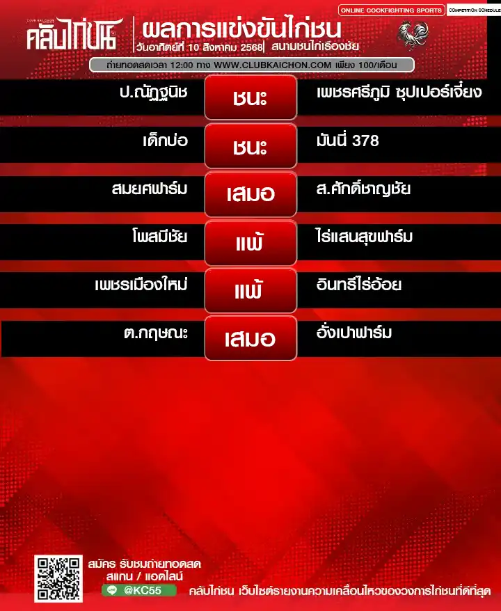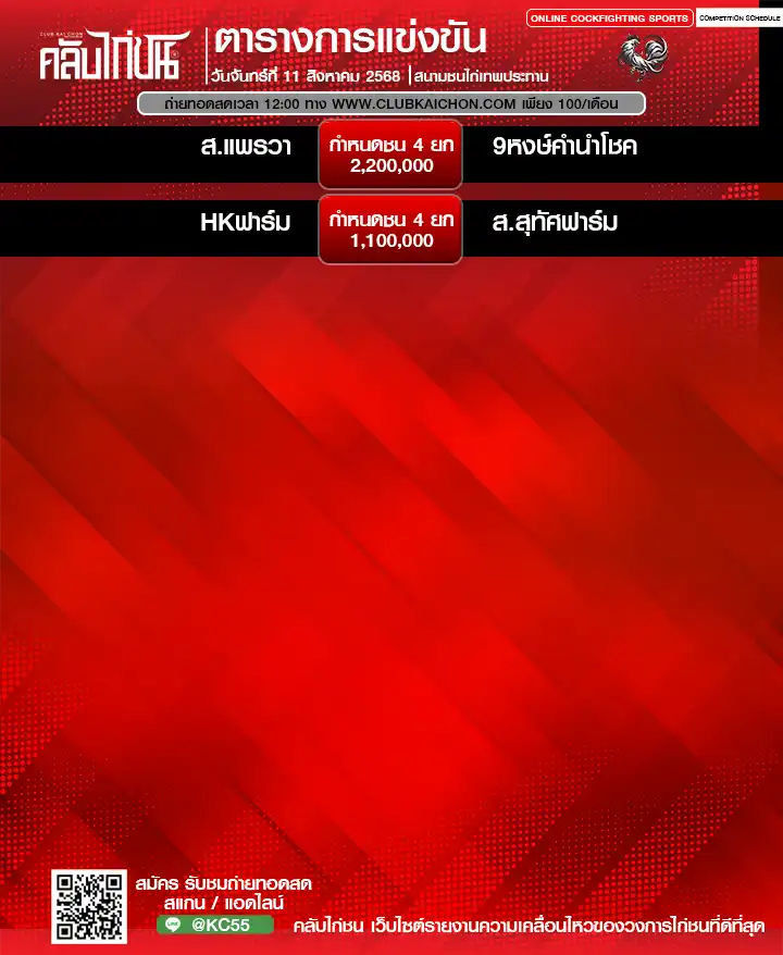 สำหรับคอไก่ชนทุกท่านที่กำลังมองหา โปรแกรมไก่ชนวันนี้ หรือต้องการรับชม ไก่ชนสด แบบเกาะติดขอบสนาม วันนี้เรามีข่าวดีมาฝาก! ทาง คลับไก่ชน ขอเชิญทุกท่านร่วมชมการแข่งขันไก่ชนออนไลน์จาก สนามชนไก่เรืองชัย ในวันที่ 11 สิงหาคม 2568 โดยสามารถรับชม ถ่ายทอดสดไก่ชน ได้ฟรี ไม่มีค่าใช้จ่าย