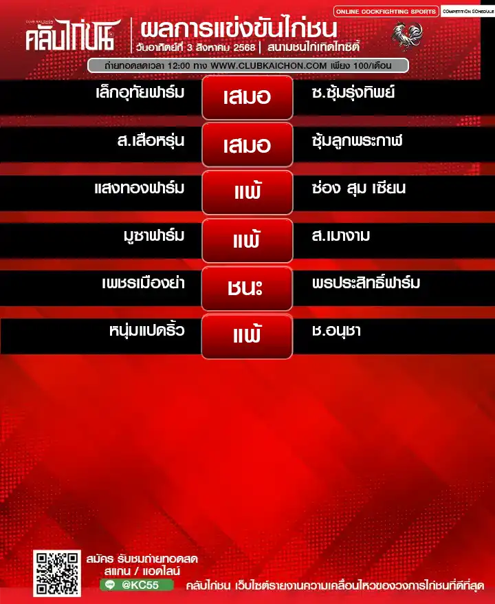 สำหรับคอไก่ชนทุกท่านที่กำลังมองหา โปรแกรมไก่ชนวันนี้ หรือต้องการรับชม ไก่ชนสด แบบเกาะติดขอบสนาม วันนี้เรามีข่าวดีมาฝาก! ทาง คลับไก่ชน ขอเชิญทุกท่านร่วมชมการแข่งขันไก่ชนออนไลน์จาก สนามชนไก่เทิดไทซิตี้ ในวันที่ 3 สิงหาคม 2568 โดยสามารถรับชม ถ่ายทอดสดไก่ชน ได้ฟรี ไม่มีค่าใช้จ่าย