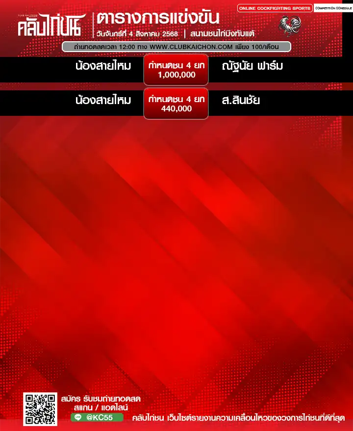 สำหรับคอไก่ชนทุกท่านที่กำลังมองหา โปรแกรมไก่ชนวันนี้ หรือต้องการรับชม ไก่ชนสด แบบเกาะติดขอบสนาม วันนี้เรามีข่าวดีมาฝาก! ทาง คลับไก่ชน ขอเชิญทุกท่านร่วมชมการแข่งขันไก่ชนออนไลน์จาก สนามชนไก่บึงทับแต้ ในวันที่ 4 สิงหาคม 2568 โดยสามารถรับชม ถ่ายทอดสดไก่ชน ได้ฟรี ไม่มีค่าใช้จ่าย