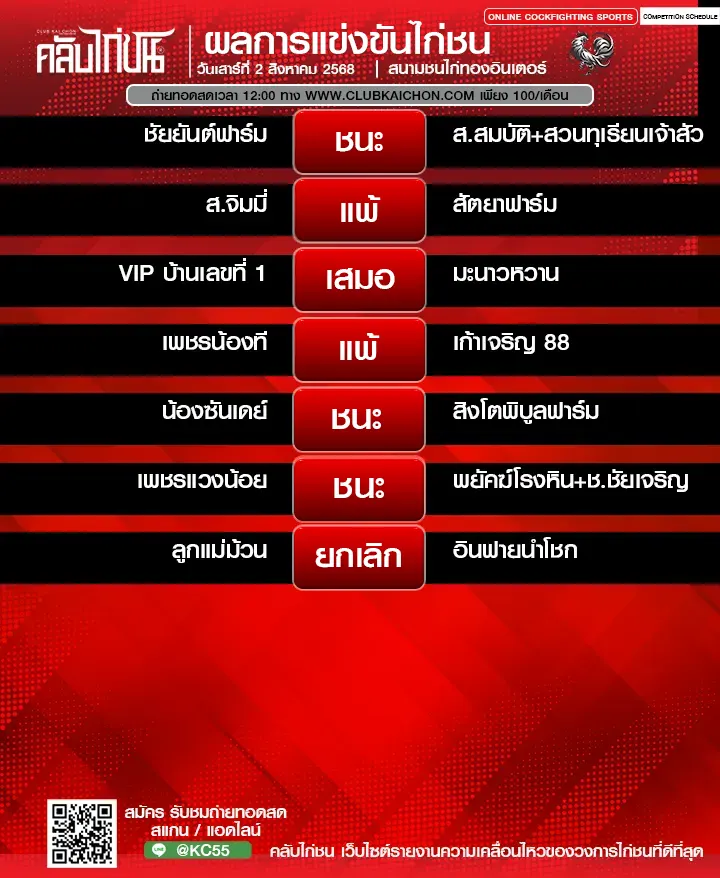 สำหรับคอไก่ชนทุกท่านที่กำลังมองหา โปรแกรมไก่ชนวันนี้ หรือต้องการรับชม ไก่ชนสด แบบเกาะติดขอบสนาม วันนี้เรามีข่าวดีมาฝาก! ทาง คลับไก่ชน ขอเชิญทุกท่านร่วมชมการแข่งขันไก่ชนออนไลน์จาก สนามชนไก่ทองอินเตอร์ ในวันที่ 2 สิงหาคม 2568 โดยสามารถรับชม ถ่ายทอดสดไก่ชน ได้ฟรี ไม่มีค่าใช้จ่าย