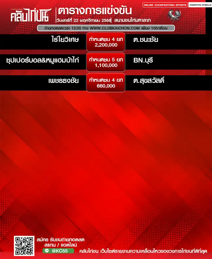 สำหรับคอไก่ชนทุกท่านที่กำลังมองหา โปรแกรมไก่ชนวันนี้ หรือต้องการรับชม ไก่ชนสด แบบเกาะติดขอบสนาม วันนี้เรามีข่าวดีมาฝาก! ทาง คลับไก่ชน ขอเชิญทุกท่านร่วมชมการแข่งขันไก่ชนออนไลน์จาก สนามชนไก่มหาลาภ ในวันที่ 22 พฤศจิกายน 2568 โดยสามารถรับชม ถ่ายทอดสดไก่ชน ได้ฟรี ไม่มีค่าใช้จ่าย