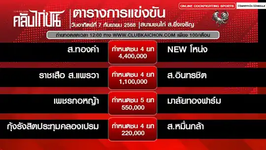 โปรแกรมไก่ชน 7 กันยายน 68 สนามชนไก่ ส.ยิ่งเจริญ