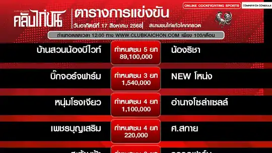 โปรแกรมไก่ชน 17 สิงหาคม 68 สนามชนไก่แก้วโคกกรวด