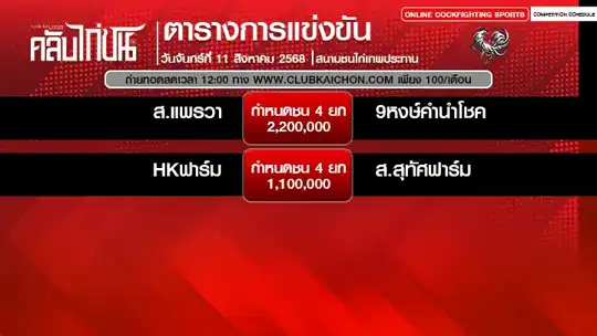 โปรแกรมไก่ชน 11 สิงหาคม 68 สนามชนไก่บึงทับแต้