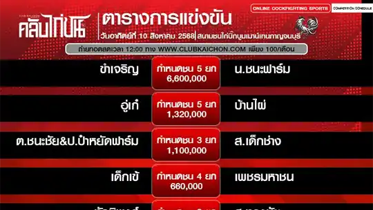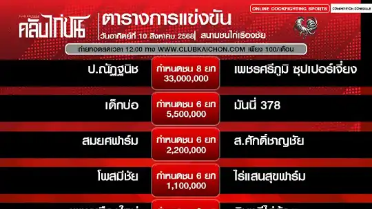 โปรแกรมไก่ชน 10 สิงหาคม 68 สนามชนไก่เรืองชัย