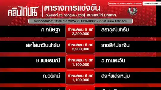 โปรแกรมไก่ชน 26 กรกฏาคม 68 สนามชนไก่มหาลาภ