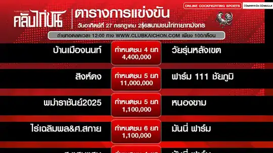 โปรแกรมไก่ชน 27 กรกฏาคม 68 สนามชนไก่ทายาทมังกร