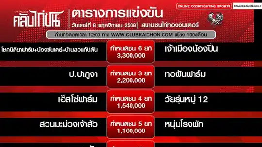 โปรแกรมไก่ชน 8 พฤศจิกายน 68 สนามชนไก่ทองอินเตอร์