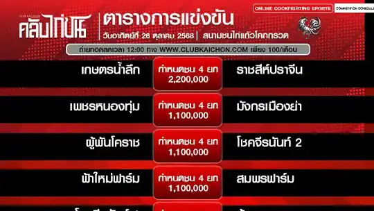 โปรแกรมไก่ชน 26 ตุลาคม 68 สนามชนไก่แก้วโคกกรวด