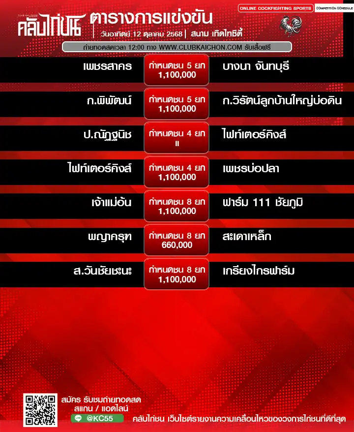 โปรแกรมไก่ชน 12 ตุลาคม 2568 สนามชนไก่เทิดไทซิตี้