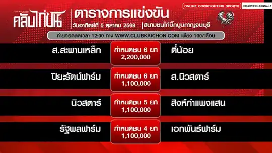 โปรแกรมไก่ชน 5 ตุลาคม 68 สนามชนไก่บิ๊กบูมกาญจนบุรี
