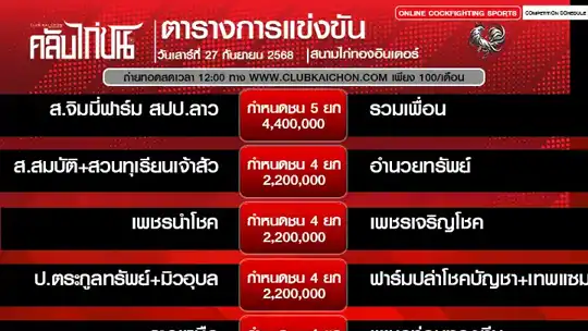 โปรแกรมไก่ชน 27 กันยายน 68 สนามไก่ทองอินเตอร์