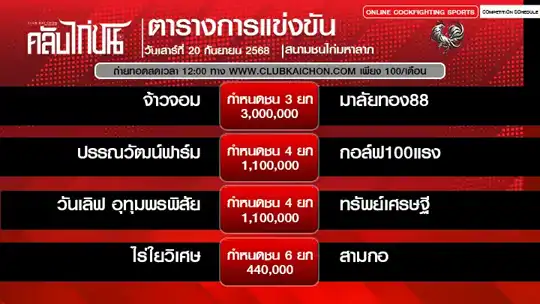 โปรแกรมไก่ชน 20 กันยายน 68 สนามชนไก่มหาลาภ