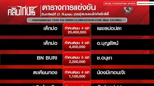 โปรแกรมไก่ชน 21 กันยายน 68 สนามชนไก่เทิดไทซิตี้