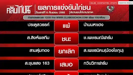 สรุปผลไก่ชน 6 กันยายน 68 สนามไก่นานาภาค