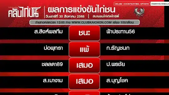 สรุปผลไก่ชน 30 สิงหาคม 68 สนามชนไก่เทิดไทซิตี้