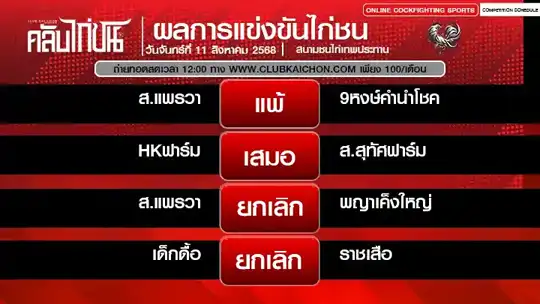 สรุปผลไก่ชน 11 สิงหาคม 68 สสนามชนไก่เทพประทาน
