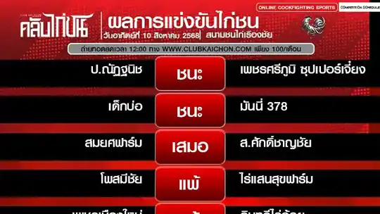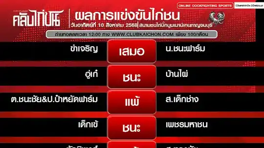 สรุปผลไก่ชน 10 สิงหาคม 68 สนามชนไก่เรืองชัย