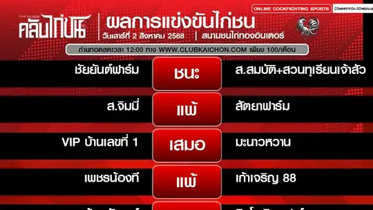 สรุปผลไก่ชน 2 สิงหาคม 68 สนามชนไก่ทองอินเตอร์