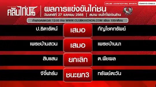 สรุปผลการแข่งขันไก่ชน 27 เมษายน 68
