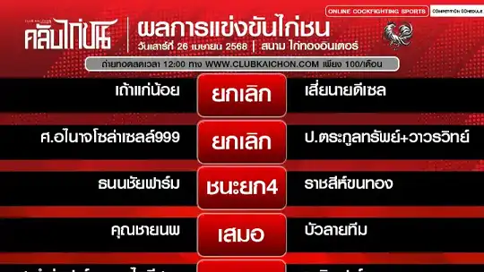 สรุปผลการแข่งขันไก่ชน 26 เมษายน 68