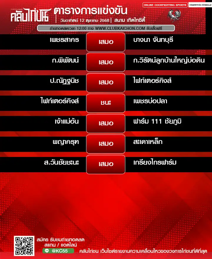 สรุปผลไก่ชน 12 ตุลาคม 2568 สนามชนไก่เทิดไทซิตี้