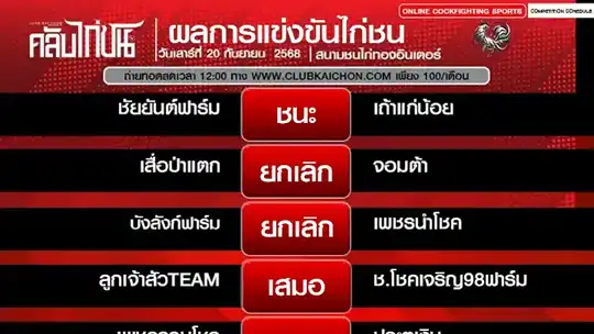 สรุปผลไก่ชน 20 กันยายน 68 สนามชนไก่ทองอินเตอร์